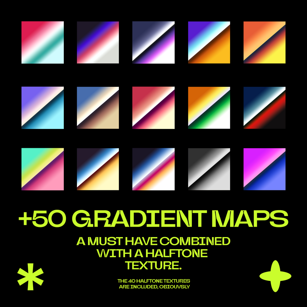 The famous Halftone effect, braken down with 40 of the best textures and 50 bonus gradient maps, to level up your designs.